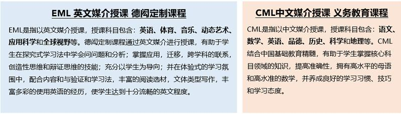 在德闳的小学和初中阶段,CML课程占据了大约50%的时间,依照中国九年义务教育的国家课程展开,兼顾学生的母语能力和学科知识;由外教进行教学的EML课程占据了另外大约50%的时间,使用的是探究式学习法。