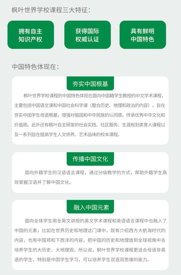 枫叶世界学校课程包括英文课程、中文课程、汉语语言课程和英语语言课程四大板块,是枫叶教育在20余年实施教学基础上,由枫叶中外教育专家、教师团队历时5年研究开发而成。枫叶世界学校课程已获得学校认证组织Cognia和英国国家学历学位认证中心UKENIC的认证,并已收到包括牛津大学在内的百余所世界大学认可函,是中国具有知识产权的国际化基础教育课程,同时也是融入中国元素的国际认证课程。