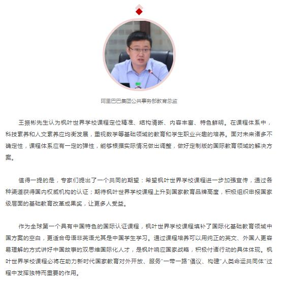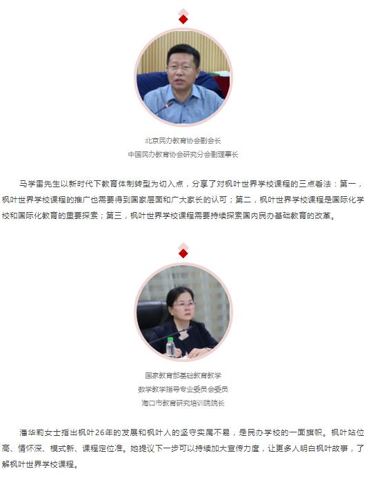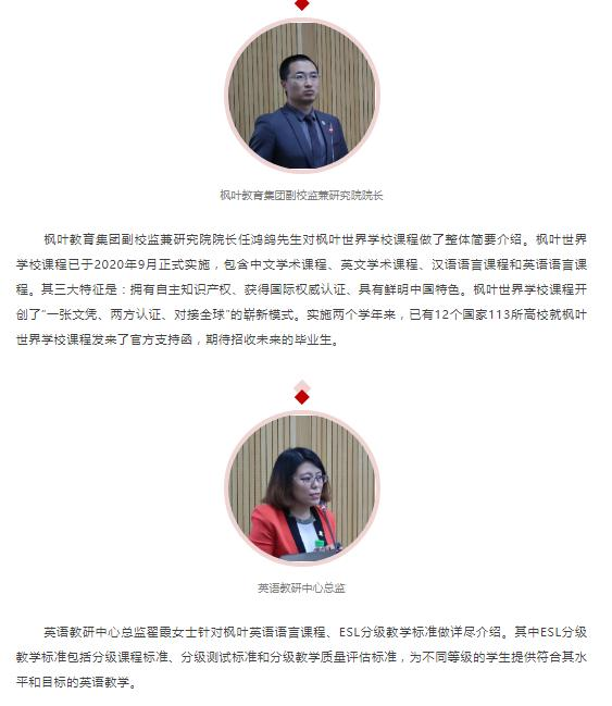 枫叶教育集团创始人·董事长任书良博士致辞表示,“自创办枫叶教育以来,我一直希望可以带领枫叶人为中国的国际教育做一点事情,那就是开发出属于中国的、拥有中国自主知识产权的国际教育课程体系,为国家和民族的伟大复兴助力,扩大中国的文化影响力和话语权。自2014年开始,枫叶教育组织了数十名中外教育专家、上百位中外一线教师,用了整整5年时间,开发了枫叶世界学校课程体系,其内容标准完全与国际接轨,同时保留了中国的文化元素和部分文科课程。在枫叶高中实施两个学年来,获得中外教师学生和家长的好评,取得了全球两大学术认证机构的对标认证和国内外113所大学的支持函。枫叶世界学校课程的研发不是平地起惊雷,我们走过了从引进到融合,再到创新的教育探索之路,建立在枫叶20多年中外课程优化实施的基础之上,凝聚了枫叶人开发中国国际课程的梦想,打破了IB、A-level等国际课程标准的垄断,打造中国国际课程的标准和体系。如今,这个梦想已经成为现实!”